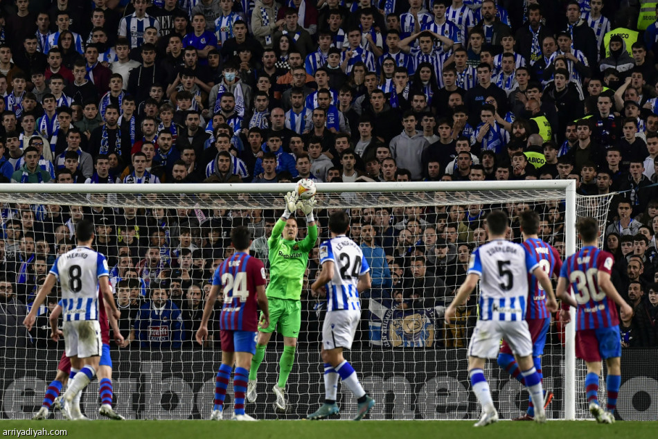 عاد فريق برشلونة الأول لكرة القدم، إلى وصافة ترتيب الدوري الإسباني لكرة القدم، بعدما انتزع فوزًا صعبًا 1-0، من ملعب ريال سوسيداد مضيفه، الخميس، في المرحلة الثالثة والثلاثين للمسابقة.وارتفع رصيد برشلونة، الذي خسر على ملعبه أمام قادش في المرحلة الماضية، إلى 63 نقطة في المركز الثانية، بفارق 15 نقطة خلف غريمه التقليدي ريال مدريد المتصدر.في المقابل، توقف رصيد سوسيداد، الذي تلقى خسارته الثامنة في المسابقة خلال الموسم الجاري، والأولى منذ 5 مارس الماضي، عند 55 نقطة في المركز السادس، بفارق 6 نقاط خلف أتلتيكو مدريد، صاحب المركز الرابع، المؤهل لبطولة دوري أبطال أوروبا في الموسم المقبل.وارتدى النجم الجابوني بيير إيميريك أوباميانج ثوب الإجادة في اللقاء، عقب تسجيله هدف برشلونة الوحيد بضربة رأس متقنة عند الدقيقة 11، فيما نال تير شتيجن لقب رجل المباراة نتيجة تألقه والمحافظة على تقدم فريقه حتى صافرة النهاية.